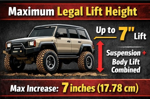 Vehicles may be lifted up to 7 inches (17.78 cm) above the manufacturer’s original height.