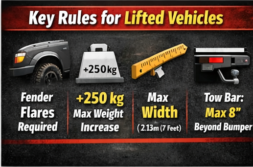 Lifted vehicles often use wider tyres and offsets. The new rule sets a maximum vehicle width: